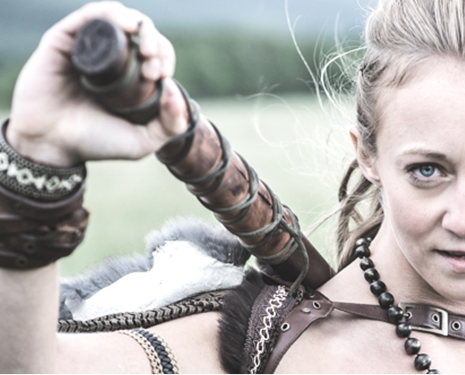 As for the banner picture. To the left (of the entire picture) add a rectangle of black space. Put your text in white. It would look as if she is pulling out an axe to slice what your text is.