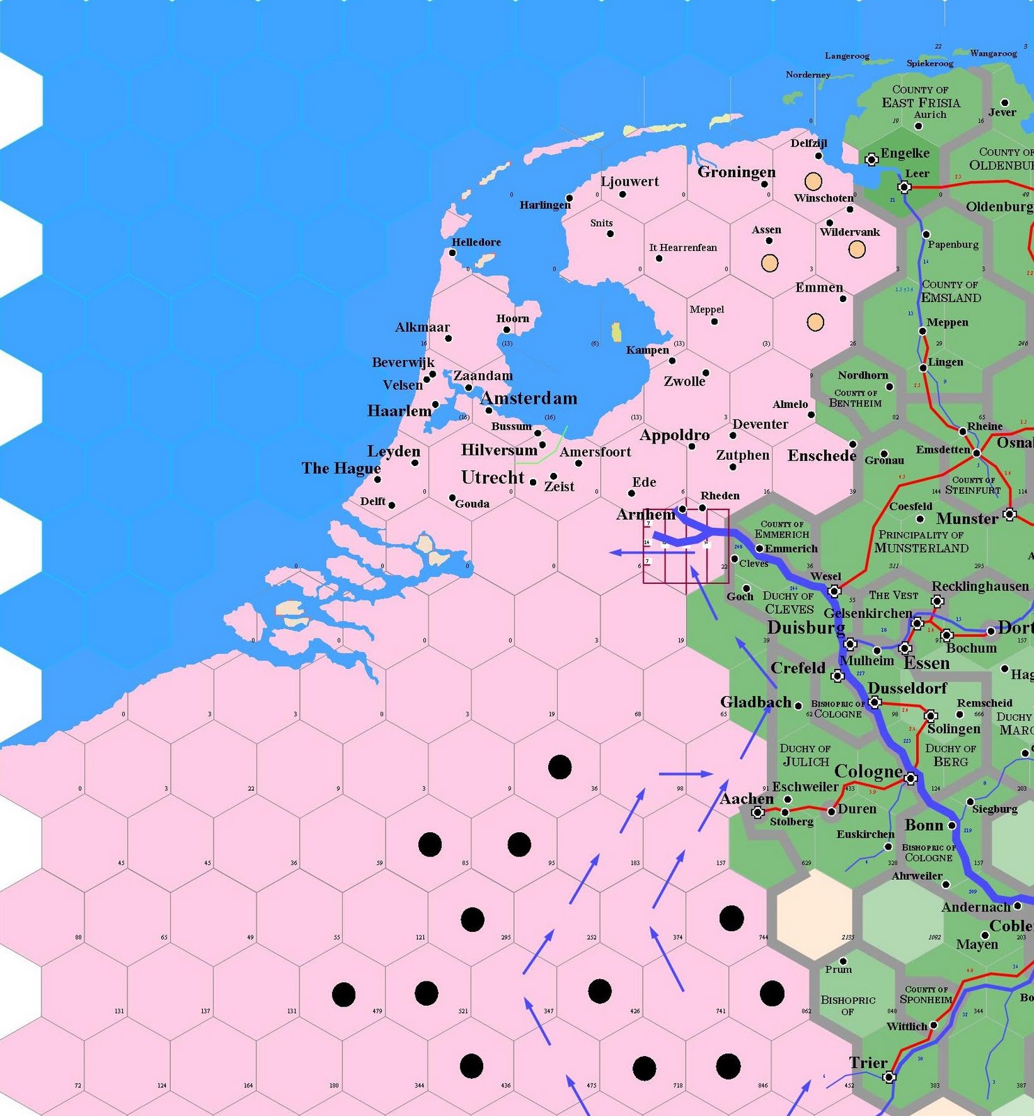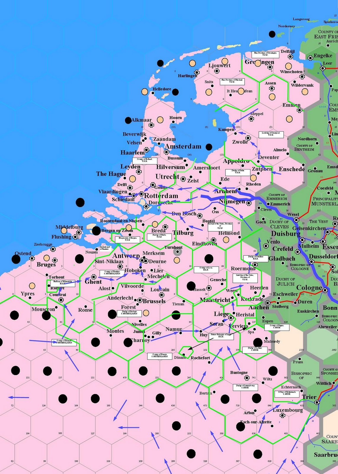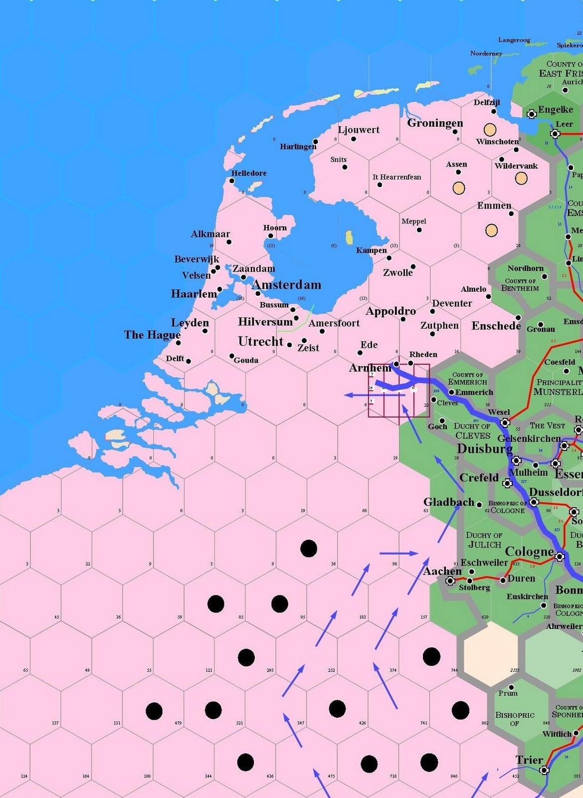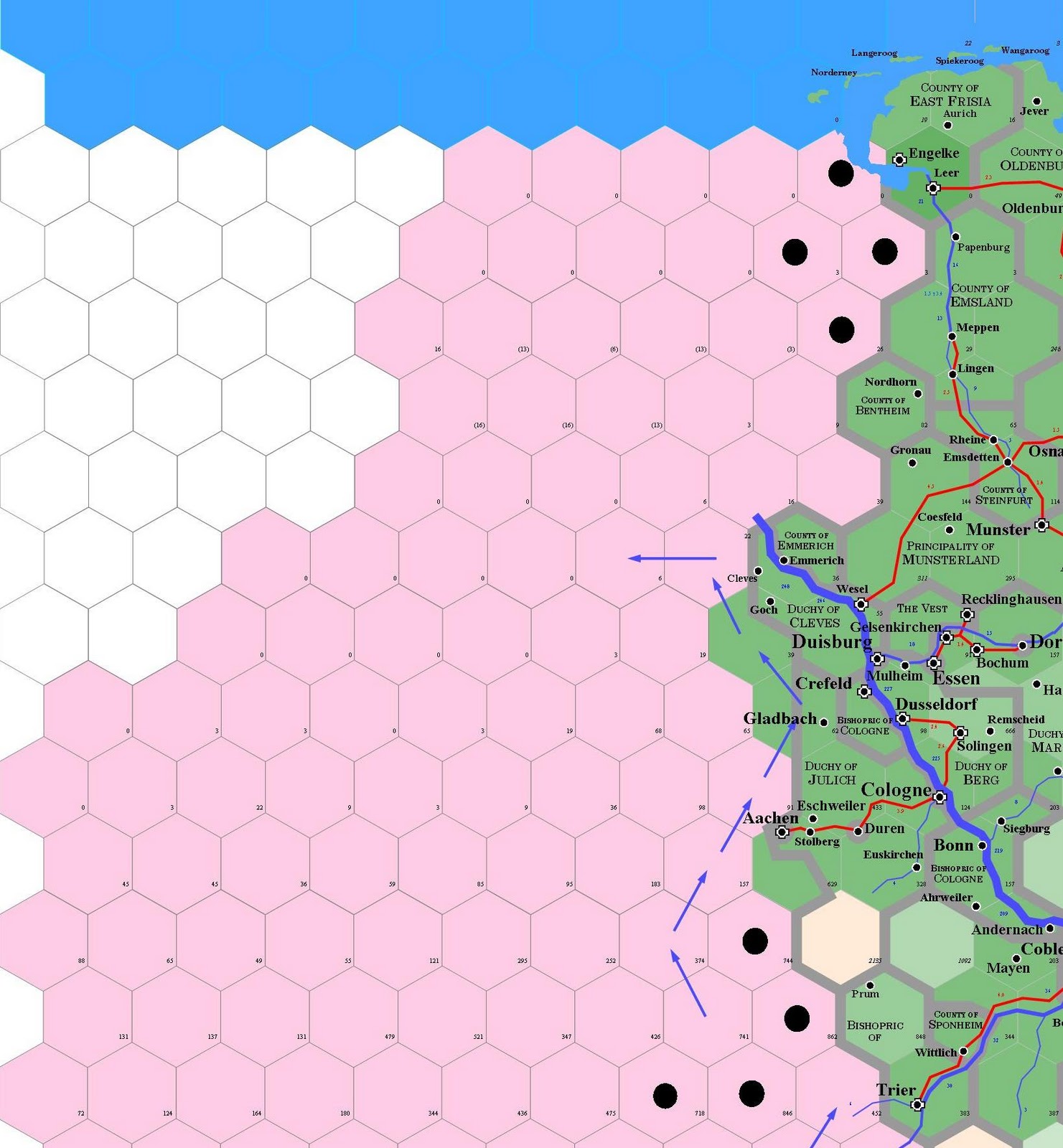 As the reader can see, I've begun plotting the cities, which is the next stage (the tool I use for plotting is on the map). Also, note that I've had to alter the border for Bentheim, having plotted the location of Enschede. One must be flexible with new information. The whole map of Germany can be found on the Wiki.